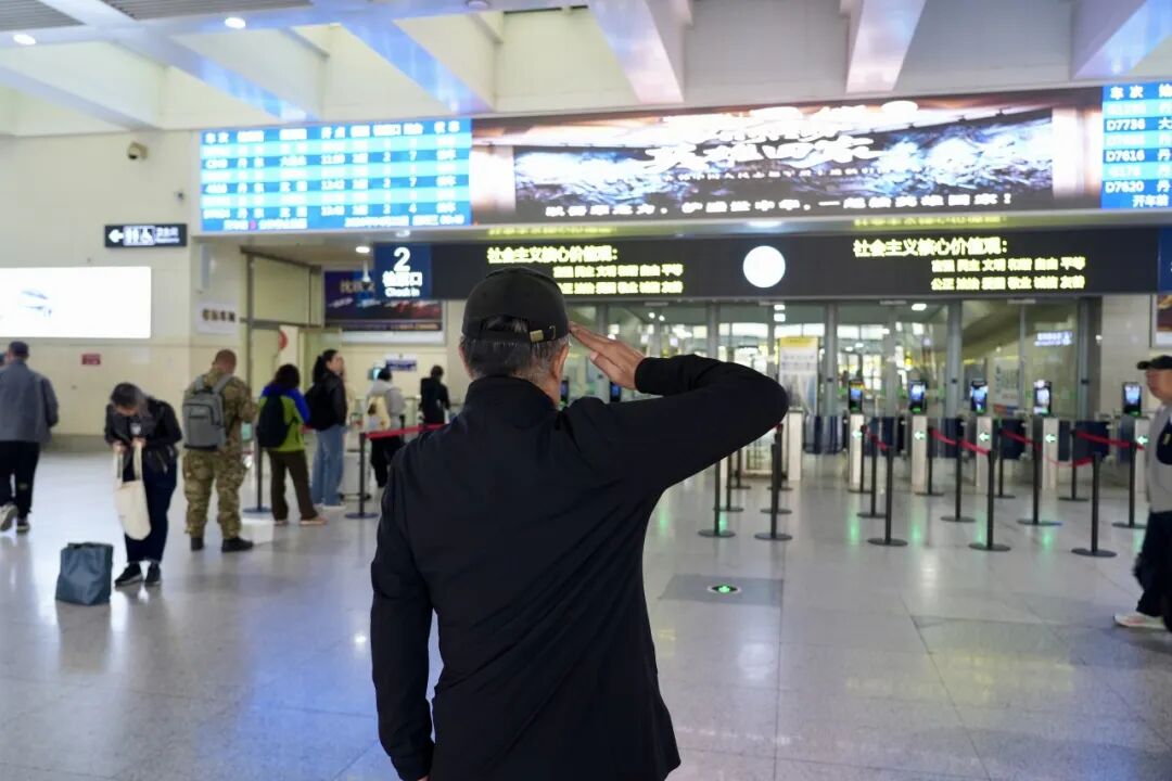 拥有22年军龄的退役老兵刘先生面对车站大屏上“山河共盼英雄回家”的海报庄重地敬了一个军礼:“保家卫国从来不是一句空话,我们要传承英烈遗志,把祖国建设得更加强大!”