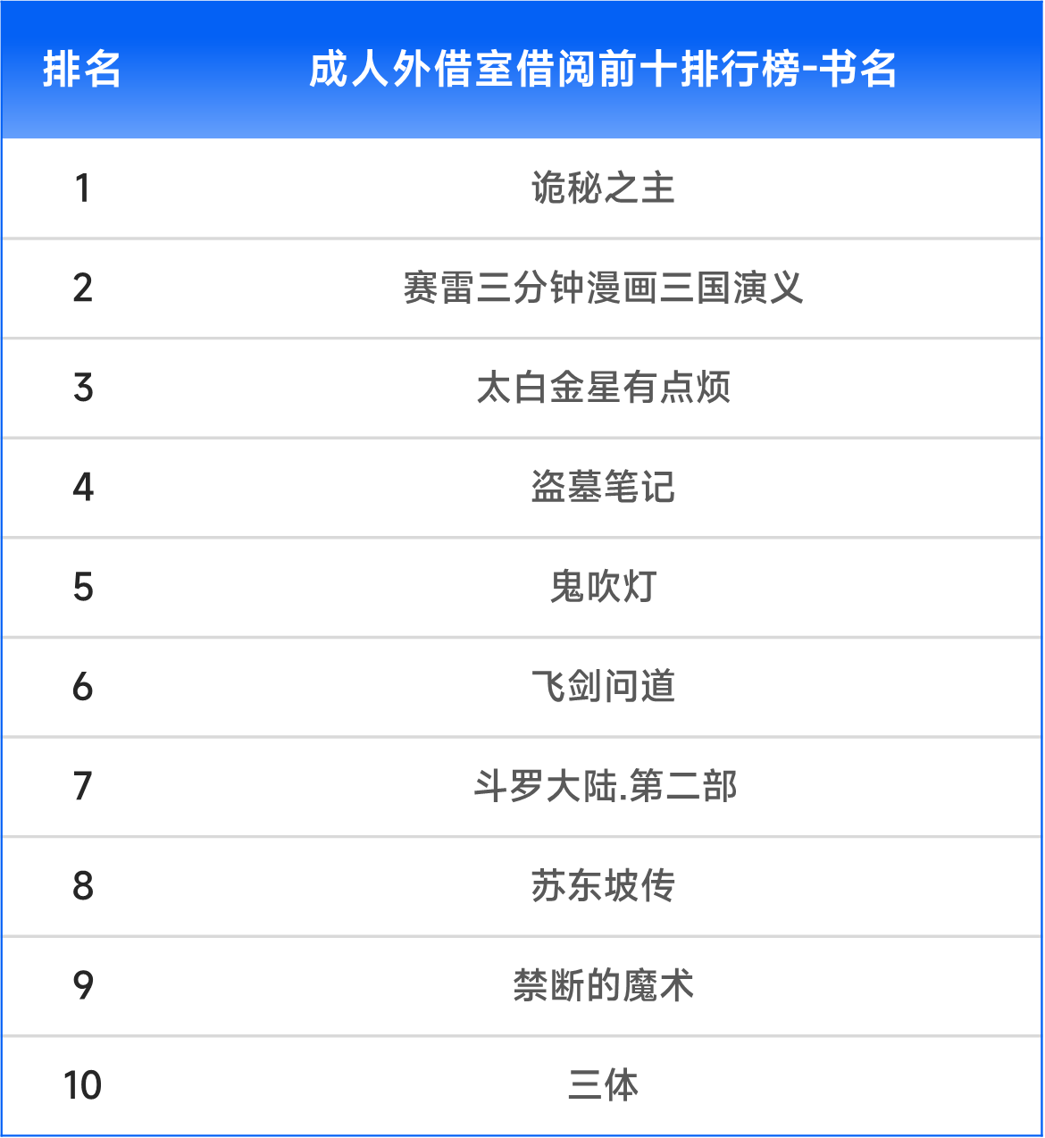 从具体书目看,成人读者中,《诡秘之主》《盗墓笔记》《三体》等作品受到欢迎;少儿读者则偏好《给孩子的成语故事》《米小圈上学记》《如果历史是一群喵》等读物。