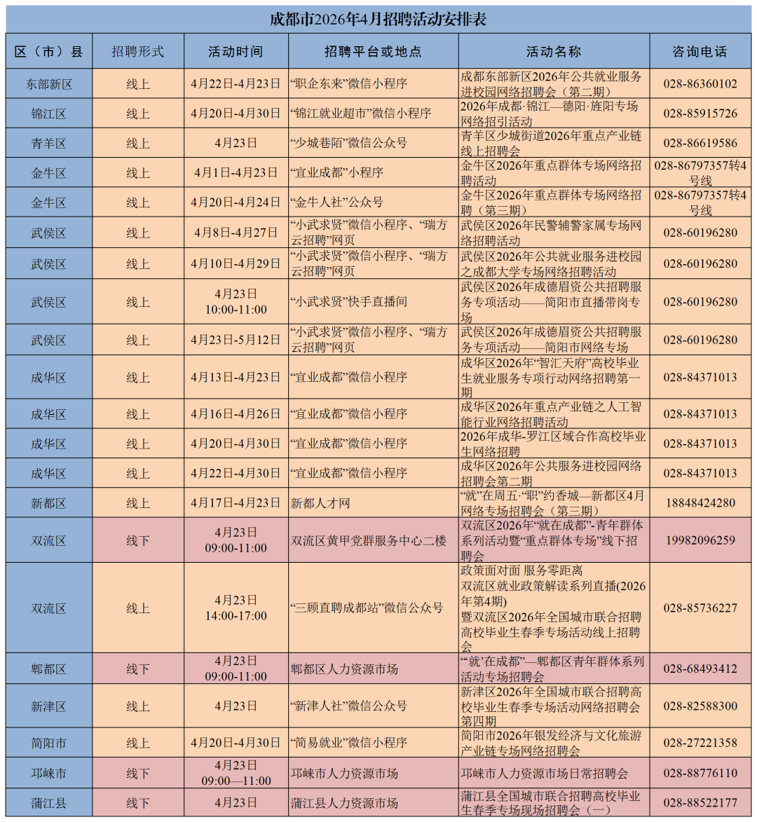今日,成都一系列线上招聘活动密集开展,具体招聘信息如下表,请大家留意场次安排,提前做好准备。温馨提示:近期,“宜业成都”小程序维护中,如出现搜索不到的情况,可通过“成都人社局”微信公众号点击微服务一就业经办栏目进入。招聘活动可能因天气、场地等因素临时调整,为确保您顺利参会,建议提前拨打活动预留电话确认详情。
