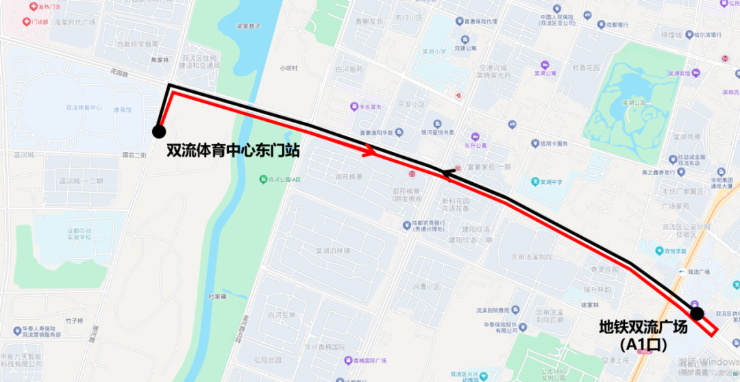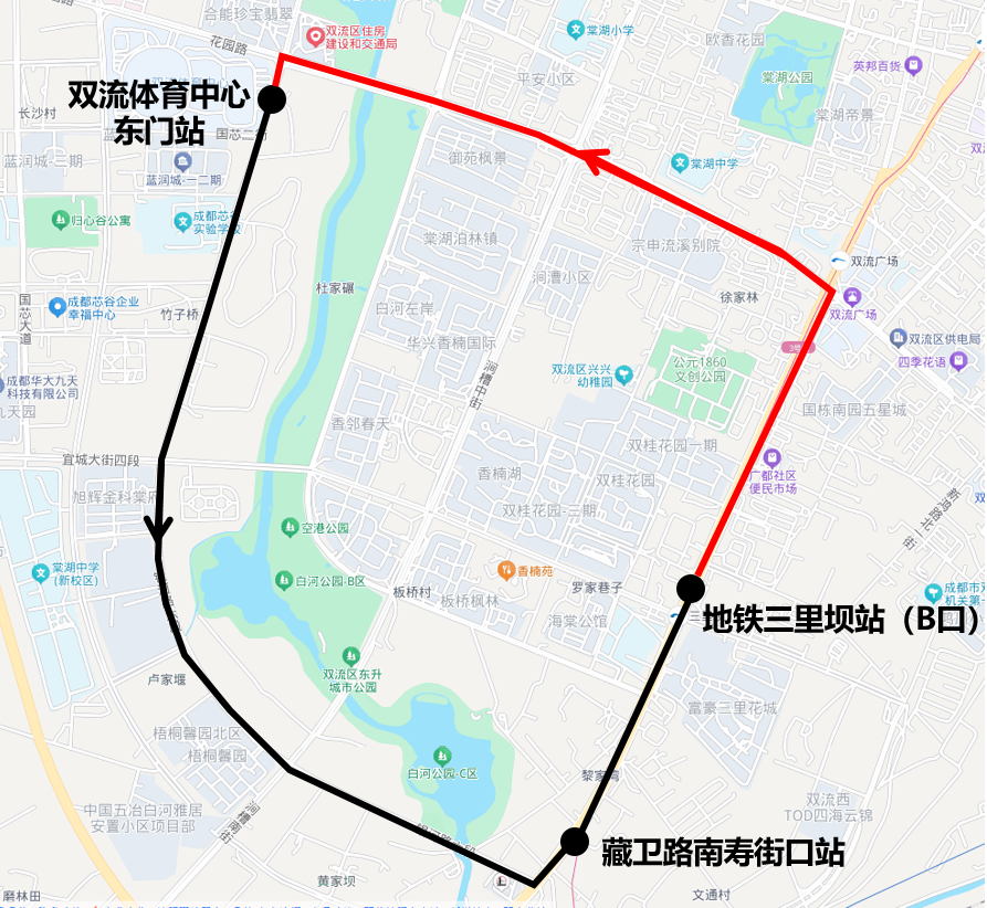 返程起讫点:双流体育中心东门站—地铁三里坝(B口)站。预计从比赛结束后开始运行,循环摆渡,同时结合客流情况灵活调整发车时间和发车间隔。