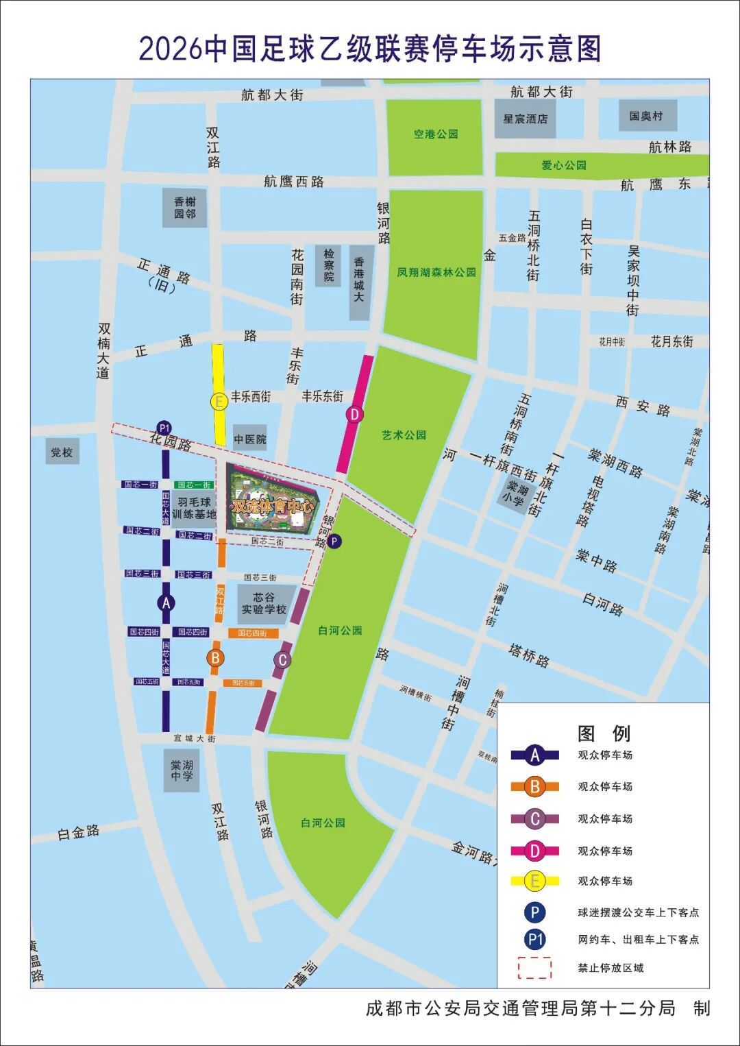 为确保比赛期间观众车辆停放有序,成都交管十二分局根据双流体育中心周边路网实际情况,设置以下A、B、C、D、E五处停车区域,供观众车辆停放。