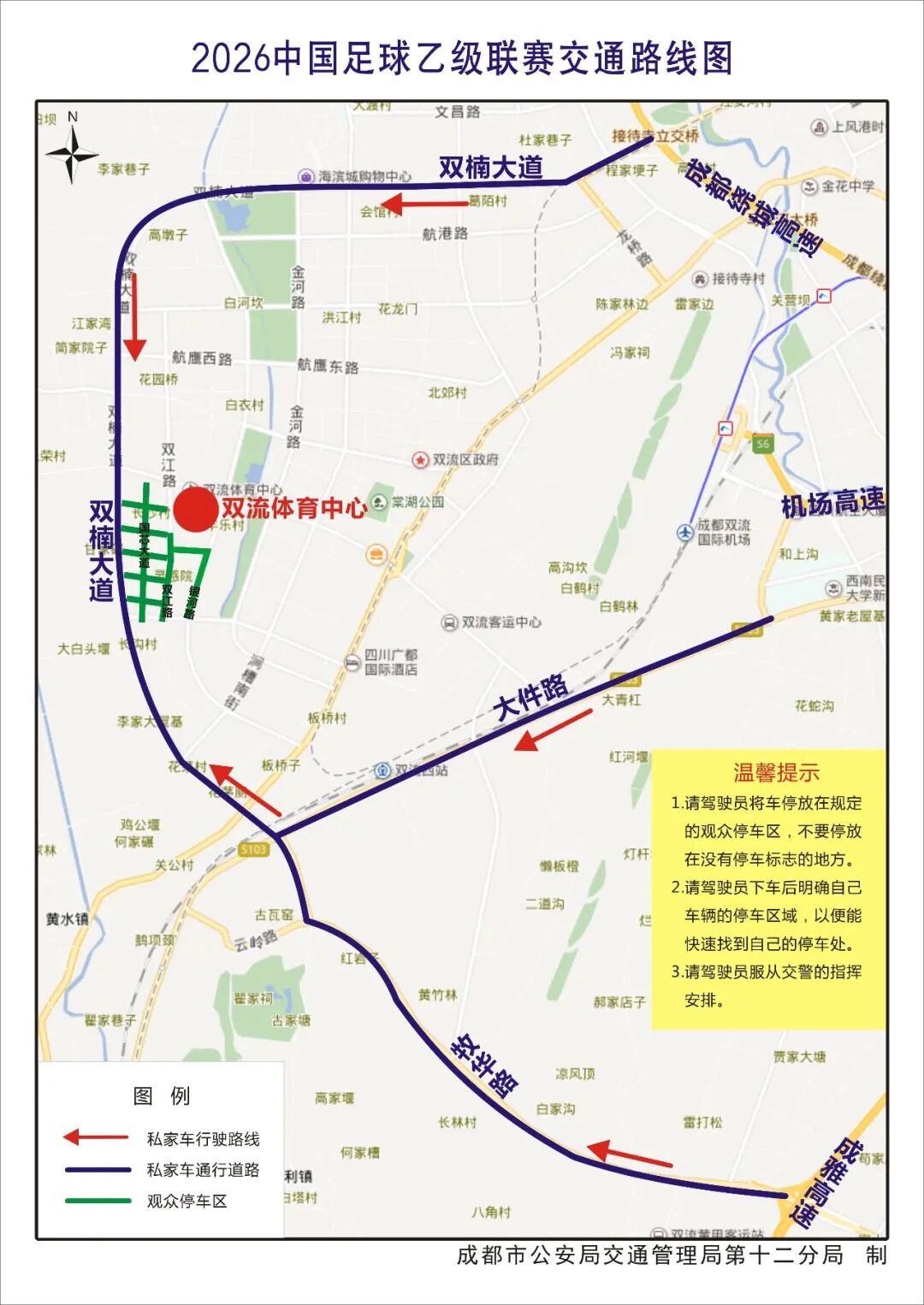 比赛期间,预计双流体育中心周边人流量、车流量大,建议广大市民尽量乘坐公共交通工具前往比赛现场。驾驶机动车到达比赛现场的市民,请自觉遵守交通安全法律法规,听从现场交警指挥。