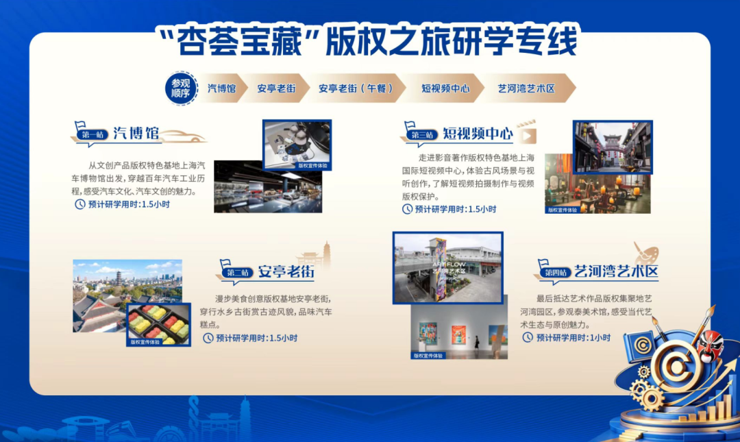 活动上,“杏荟宝藏”版权之旅研学专线发布。线路串联起安亭四大版权特色点位,融合了汽车文创、老街美食、影音创作、艺术作品等多元的版权场景,线路主要以文旅行走为载体,沉浸式展现不同领域的原创成果。