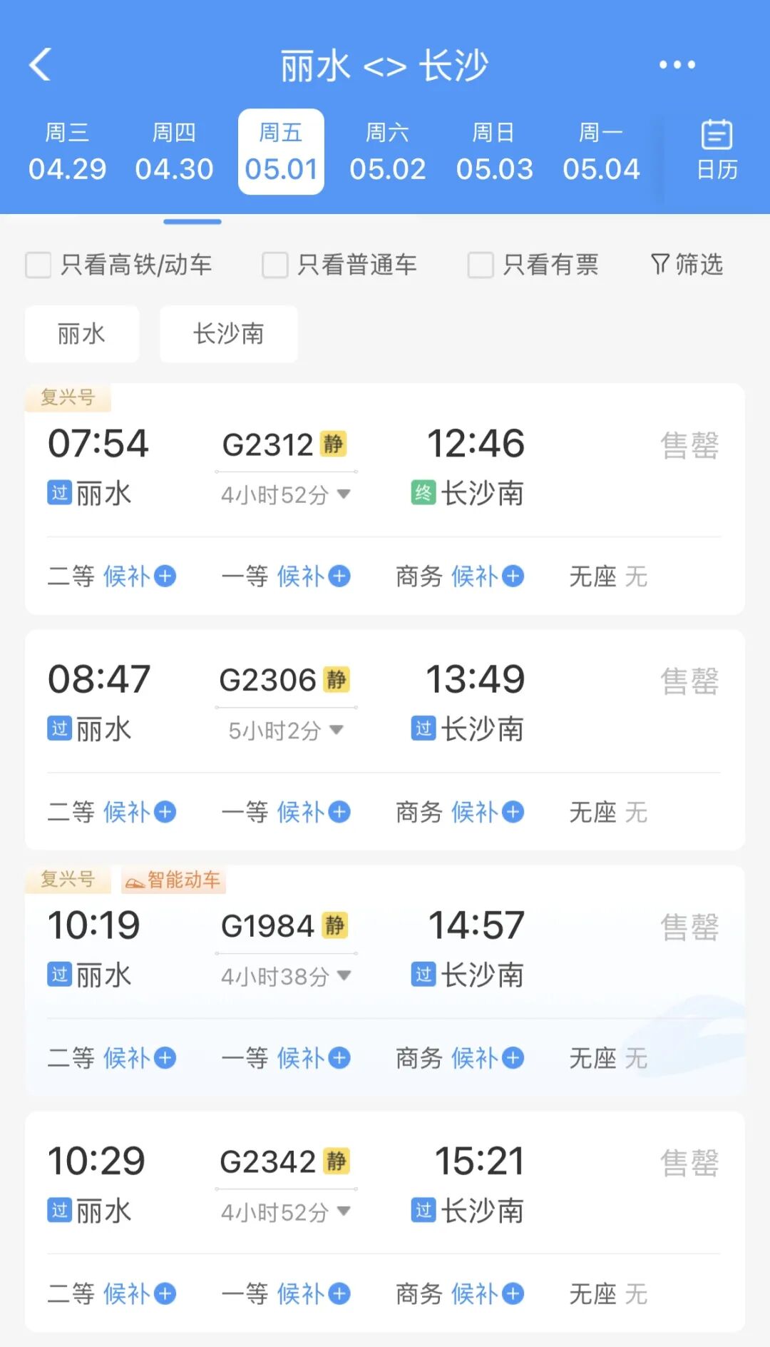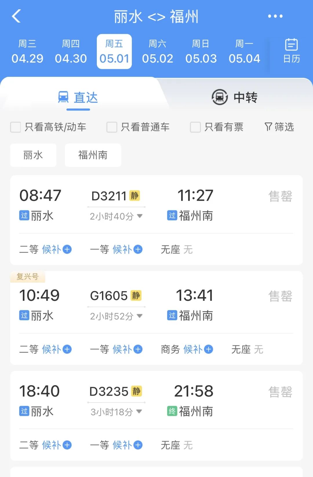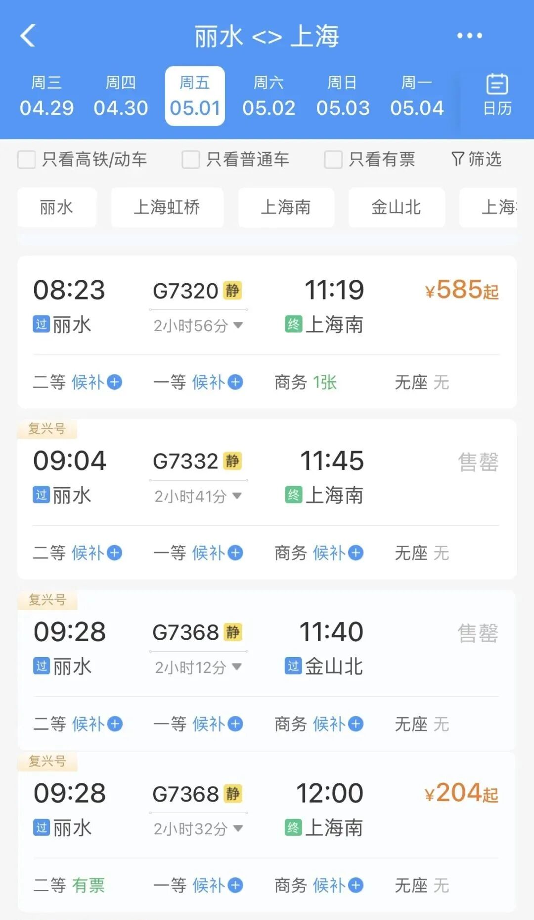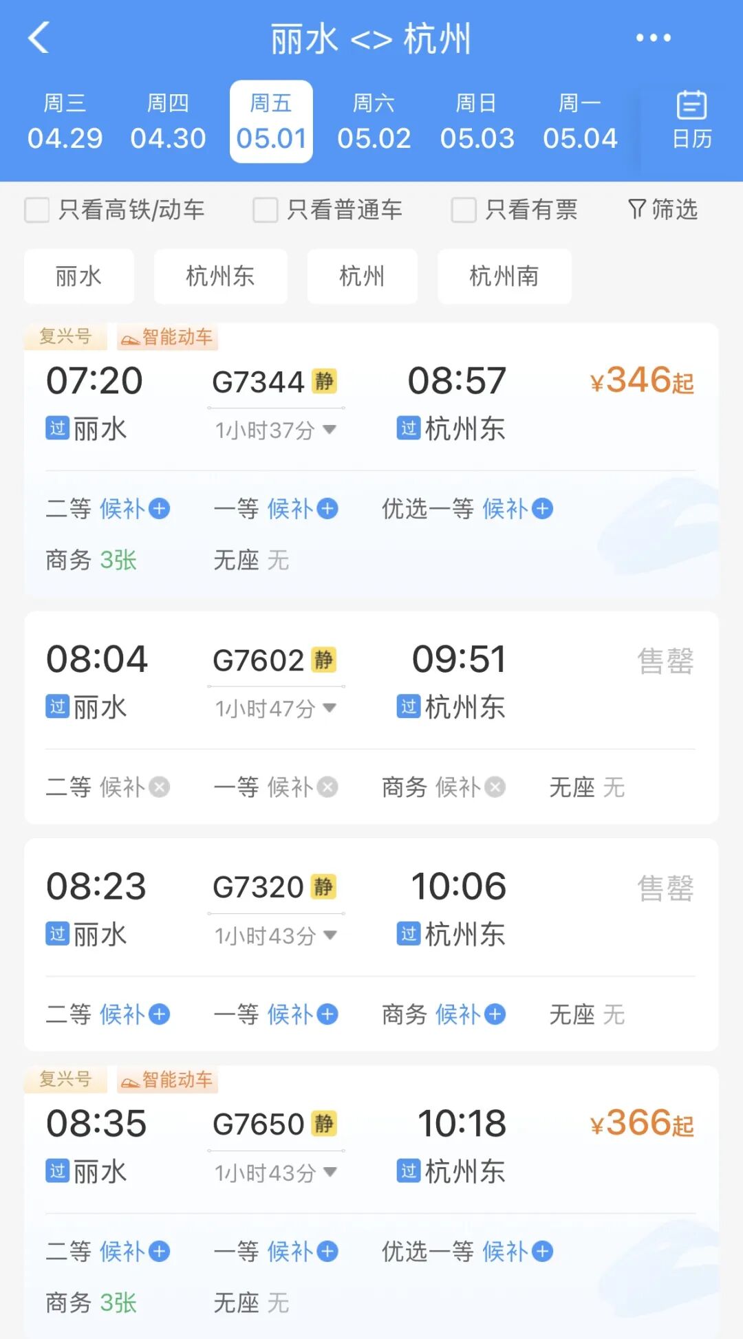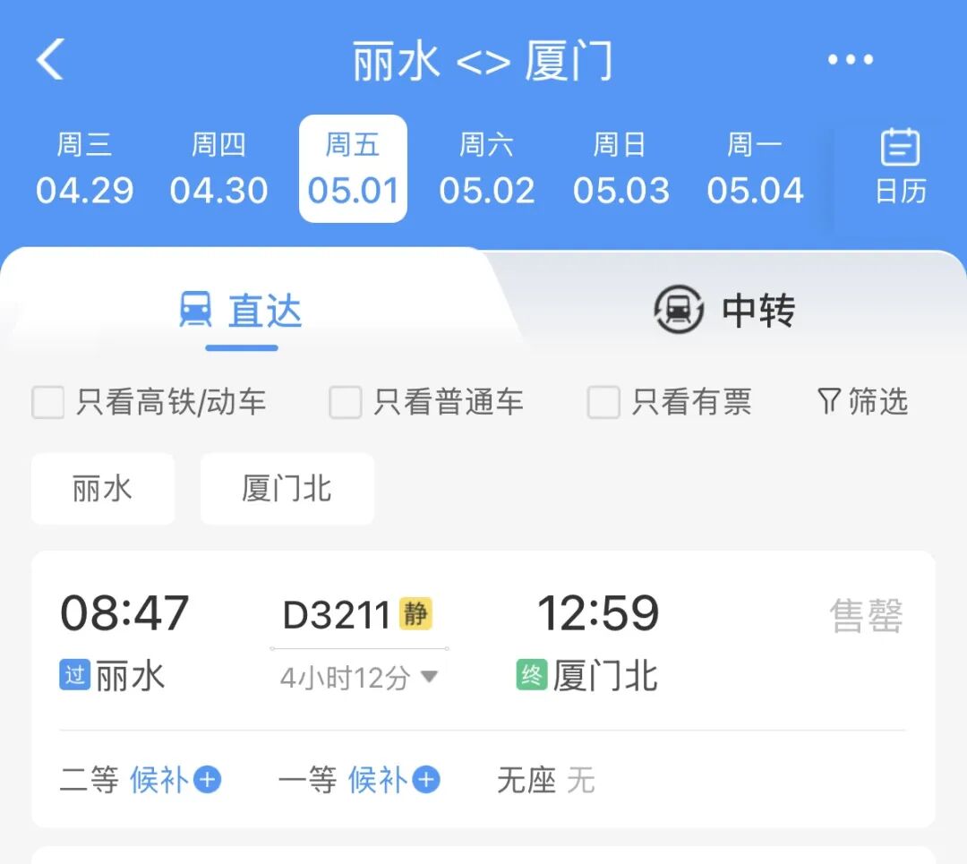 记者查询铁路12306App发现,春假、“五一”假期期间丽水站高铁票销售火爆。5月1日,前往长沙、福州、厦门等旅游热门方向的高铁票已全部售罄。往杭州、上海、北京方向的动车组列车部分车次有少量余票。