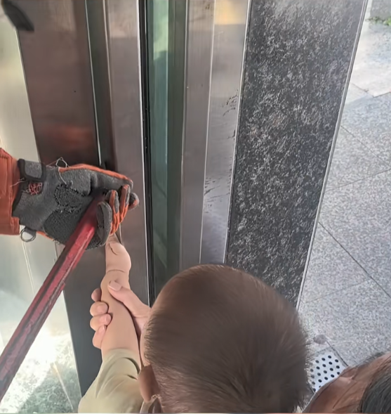 湖南邵阳,一名幼童在乘坐电梯时,将手放在门上玩耍,结果不慎被夹。消防员紧急到场使用专业工具助其脱困。