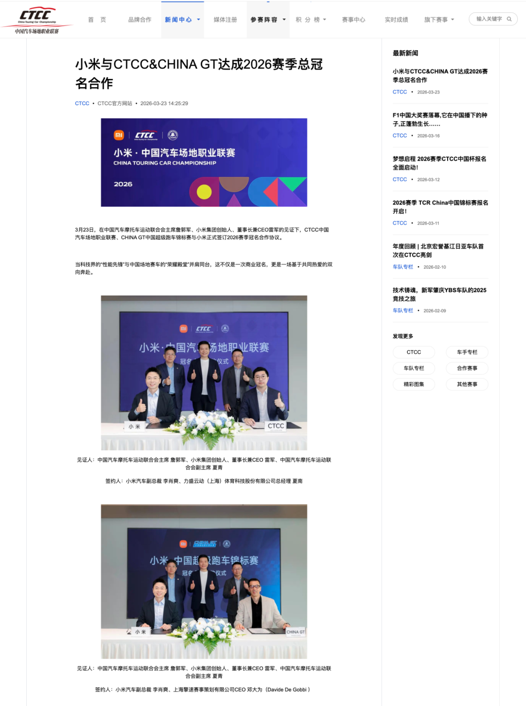 2026年3月,小米集团创始人雷军与中国汽摩联主席詹郭军共同见证了一个历史时刻:小米与CTCC、China GT、CEC三大国家级A类赛事正式签订2026赛季冠名合作协议。小米SU7 Ultra和YU7分别担任赛事官方安全车和医疗车。在China GT上海揭幕战中,47台赛车参赛创历史新高,涵盖GT3、GT4、GTC等组别,法拉利、保时捷、兰博基尼、奔驰AMG等国际品牌与小米、蔚来、极氪等国产新能源超跑同场竞技,燃油与电动的巅峰对决看点拉满。