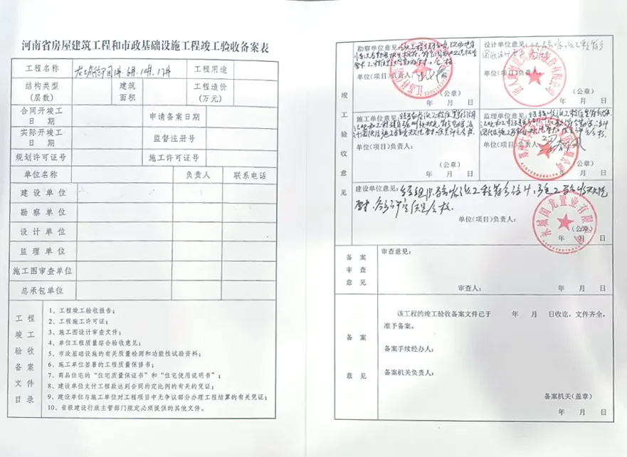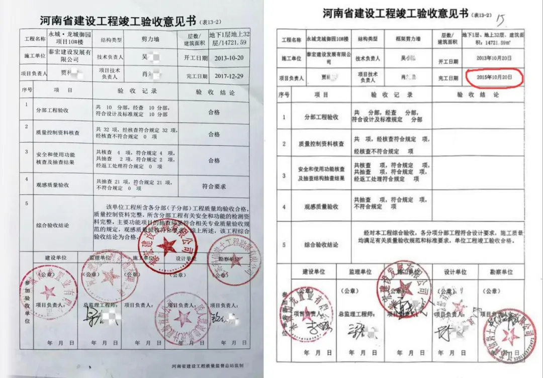 在采访中,记者注意到除工程延误损失款争议外,项目竣工时间亦存在不同记载。谷先生向记者提供的一份《河南省建设工程竣工验收意见书》显示,项目完工时间为2017年12月29日;而另一份加盖了公章的《竣工验收意见书》,竣工日期标注为2015年10月20日,两者相差两年多。