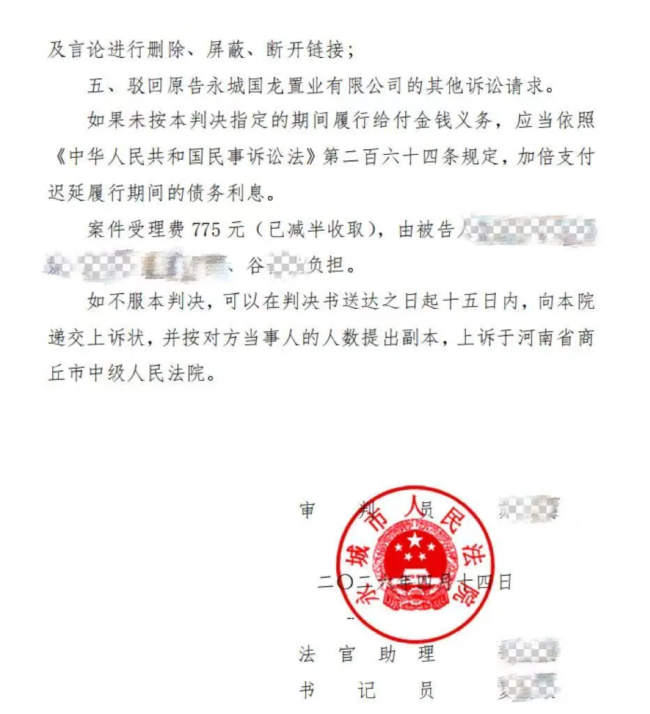4月21日,记者从谷先生出示的判决书看到,河南省永城市人民法院就永城国龙置业有限公司(以下简称:永城国龙置业)起诉谷先生及其关联公司名誉侵权一案于2026年4月14日,作出(2026)豫1481民初669号判决:删除相关发帖、公开道歉,并赔偿损失40000元,该费用主要为原告为固定证据支出的公证费用。
