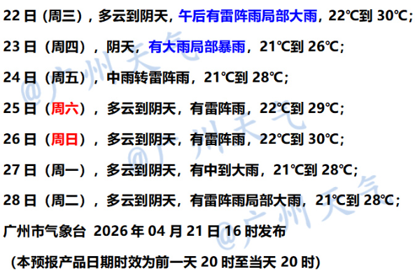 广州市气象台预计,4月22日午后至23日,受高空槽、切变线及弱冷空气影响,有大雨局部暴雨(35~45毫米局部50~90毫米),伴有短时强降水(最大小时雨强20~40毫米)和8级左右雷雨大风、局地冰雹等强对流天气,最高气温明显下降。4月24日降水减弱,白天以雷阵雨为主。