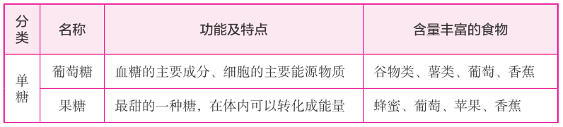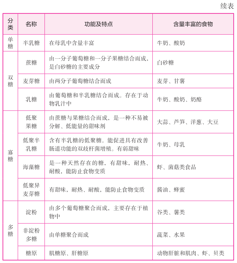 碳水化合物通常根据含有的单糖数目分为单糖、双糖、寡糖、多糖。碳水化合物富含于以下食物中:谷类、根茎类、豆类、蔬菜、水果、牛奶或奶制品等。表3-1简要列出了糖的分类及功用。
