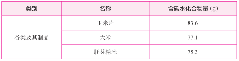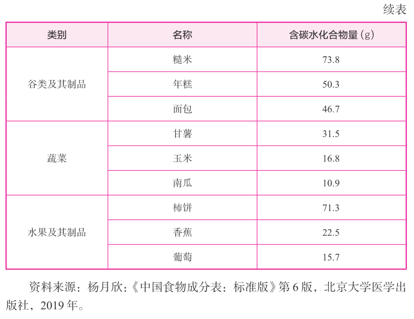 碳水化合物主要来源于植物性食物,如膳食中淀粉的来源主要是粮谷类和薯类食物(见表3-3);单糖和双糖的来源主要是蔗糖、糖果、甜品、糕点、水果、含糖饮料和蜂蜜等。碳水化合物广泛分布于自然界中,按食物来源大致可分为以下几类:谷类、根茎类作物、食糖作物、蔬菜和水果。日常应尽量以粮食和薯类为主要来源,同时为了得到一定数量的纤维素,还应多吃蔬菜水果,少吃精制糖类。