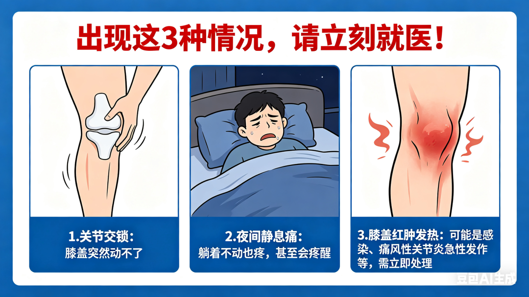4.重视信号:出现关节交锁、夜间静息痛、红肿发热,务必及时就医。