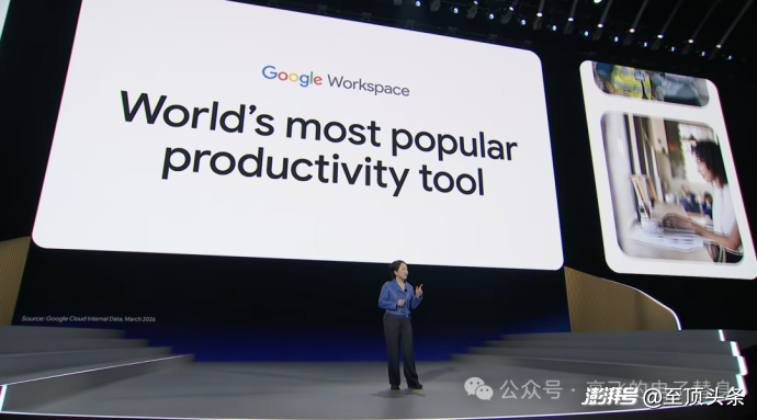 她将这称为"上下文税"(context tax),然后宣布了Workspace Intelligence,一个存在于每个Workspace应用中的统一智能层。它利用Gemini的推理能力和嵌入模型,连接Gmail、Docs、Sheets、Slides、Chat中的各种信息节点,消除上下文碎片化。