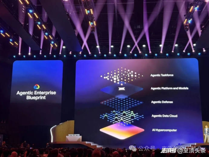 Pichai说,我们的任务已经从"我们能不能构建一个Agent"变成了"我们如何管理数千个Agent"。这可以说是整场Keynote的支点。因为Kurian随后展开了"Agentic Enterprise蓝图"的五层架构体系:AI Hypercomputer、Agentic Data Cloud、Agentic Defense、Gemini Enterprise Agent Platform、Agentic Task Force,从芯片到应用逐层堆叠。