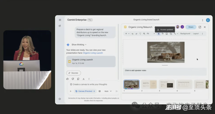 Applied AI前线工程师Erica Chuong的演示将上述能力串在了一起。场景是一家全球家具零售商。用一个提示词,多个Agent在数分钟内完成了:Market Research Agent分析搜索趋势和销售数据、Data Insights Agent连接全球产品目录识别滞销库存、Product Strategy Agent汇总信息并给出重新定价建议。随后Dev Agent直接连接Jira为工程团队创建ticket,门店运营团队通过Gemini Enterprise生成品牌化演示文稿。新的Canvas模式允许直接在Gemini Enterprise中编辑Google Slides,无需切换应用,呼应"消除上下文碎片化"的主题。