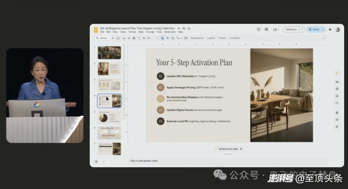 演示场景中,Kim以区域分销商的身份在Google Chat中操作。通过Ask Gemini,Chat变成了命令中心:Gemini告诉她现在什么最紧急,直接定位到包含所需图表的文档,大海捞针,秒级解决。然后通过标记特定的Regional Campaign Skill,Workspace Intelligence交叉引用邮件、聊天、HubSpot数据和品牌模板,一次性生成了一份完整的Google Slides演示文稿。Kim指着结果说:"看起来像是由创意专家设计的,而不是从终端里出来的。"