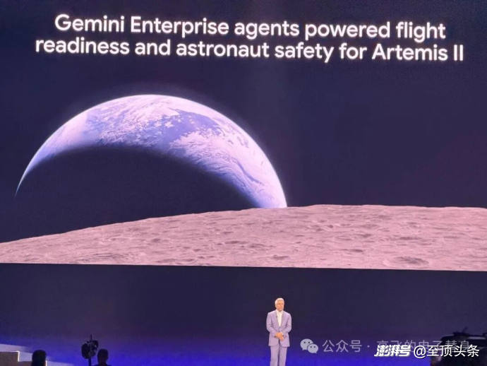 NASA Artemis II。 Google Cloud与NASA合作,使用Gemini Enterprise Agent支持Artemis II的飞行准备工作和宇航员安全保障。Kurian特别强调,Artemis II创下了人类航天史上距离地球最远的飞行纪录。