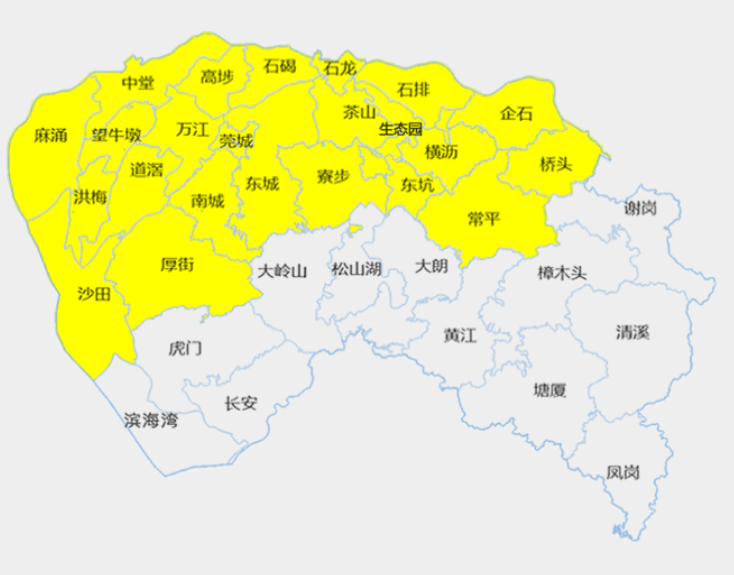 目前佛山、广州一带有强雷雨云带向我市西北部靠近,预计自10时30分前后起,未来3小时,我市中北部镇街自西向东将先后有强雷雨,时雨强30毫米左右,并伴有8级左右短时大风,东莞市气象台于4月23日9时59分对莞城、东城、南城、万江、高埗、石碣、麻涌、望牛墩、中堂、寮步、沙田、厚街、道滘、洪梅、茶山、石龙、石排、企石、东坑、横沥、桥头、常平、生态园发布分镇暴雨黄色和雷雨大风黄色预警信号,请注意防御。