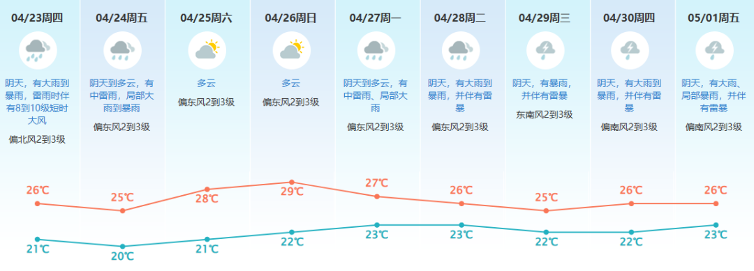 据东莞市气象台:预计我市23—24日受高空槽、弱冷空气和切变线的共同影响,有较强雷雨过程,并伴有短时强降水和8到10级短时大风等强对流天气,强雷雨时段主要在23日中午前后到傍晚;25—26日多云为主;展望27日—5月1日又将连日有较强雷雨过程。