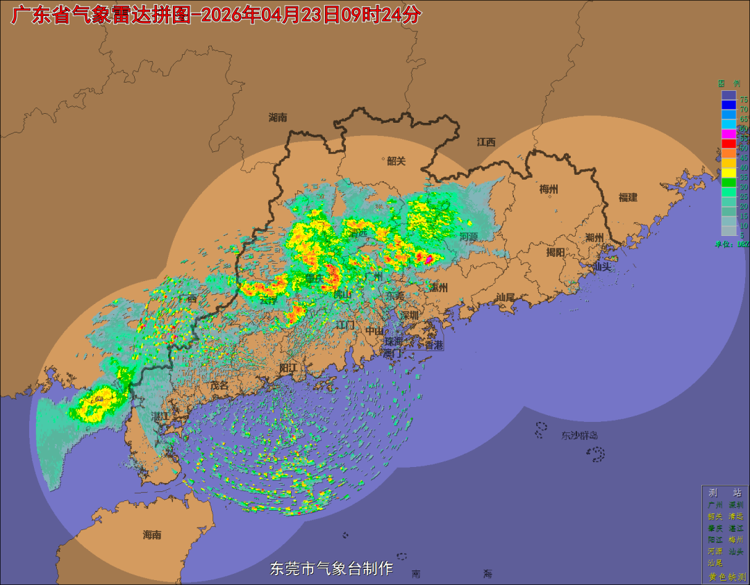 东莞市气象台4月23日08时30分发布:目前广州一带有雷雨云团向我市西北部靠近,预计未来6小时我市大部分镇街有阵雨或雷阵雨,间中雨势较大,并伴有6到7级阵风,请注意防御。
