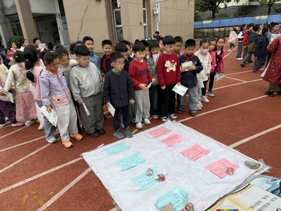 2号“阅”海投壶区,孩子们凝神投箭,命中后立刻背诵课本古诗,清脆童声回荡操场;3号智“转”山海大转盘前,指针停下的瞬间,孩子们勇敢朗读课文、猜文学人物,自信大方,表现亮眼。每完成一项挑战,老师便盖上一枚可爱印章。集满五枚印章的“读书娃”们,脸上洋溢着自豪与喜悦。