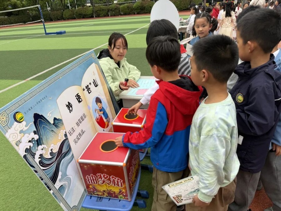 游园会以“山海”为文化内核,精心设置了“山”呼海应(套圈)、“阅”海投壶、智“转”山海(大转盘)、“沙”场点兵(扔沙包)、妙语“答”山(抽题箱)五大闯关区域,将传统游戏与阅读学习深度融合。一、二年级语文老师紧扣共读绘本《春天的野餐会》《山海经》、课本内容及经典古诗,设计了层层递进的趣味题目。