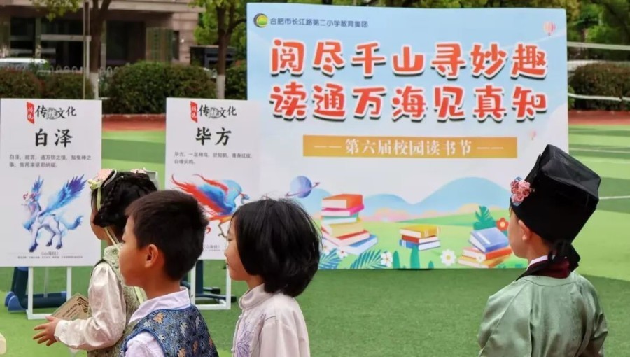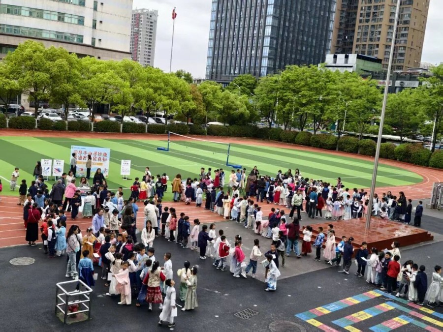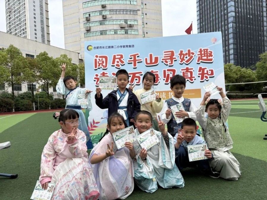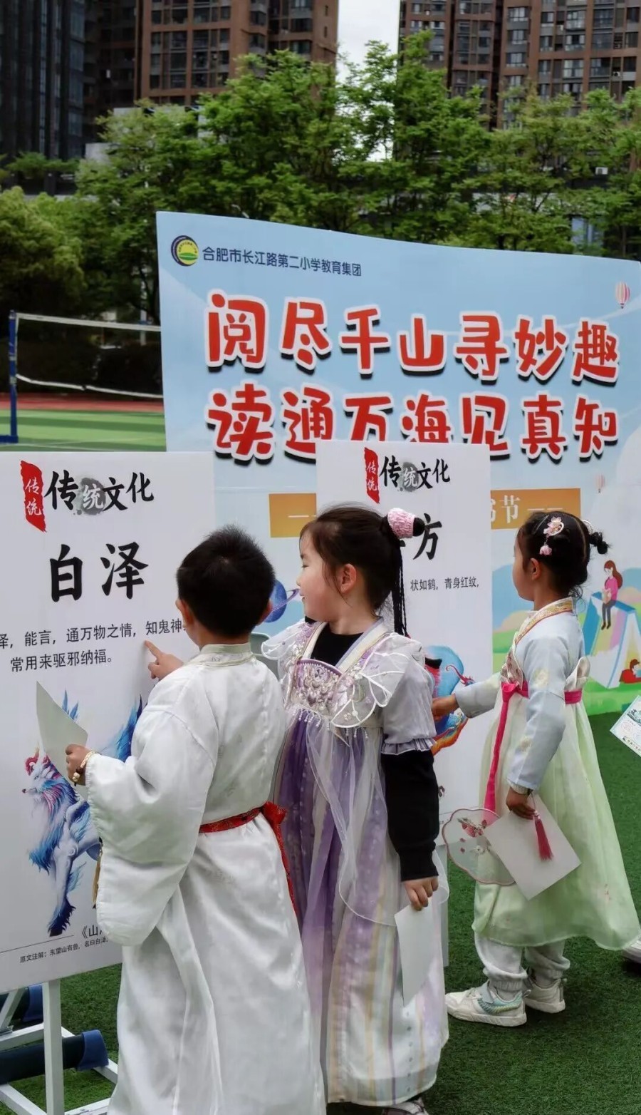 4月20日下午,虽天阴云低,合肥市长二小栢景湾校区校园内却书香四溢、热闹非凡。一、二年级全体师生身着精美古装,齐聚操场,共赴一场别开生面的读书节特色活动——“山海游园会”。孩子们化身小小书童,手持“山海行”读书集章卡,穿梭于五大主题打卡点,开启了一段趣味与书香交融的游园之旅。