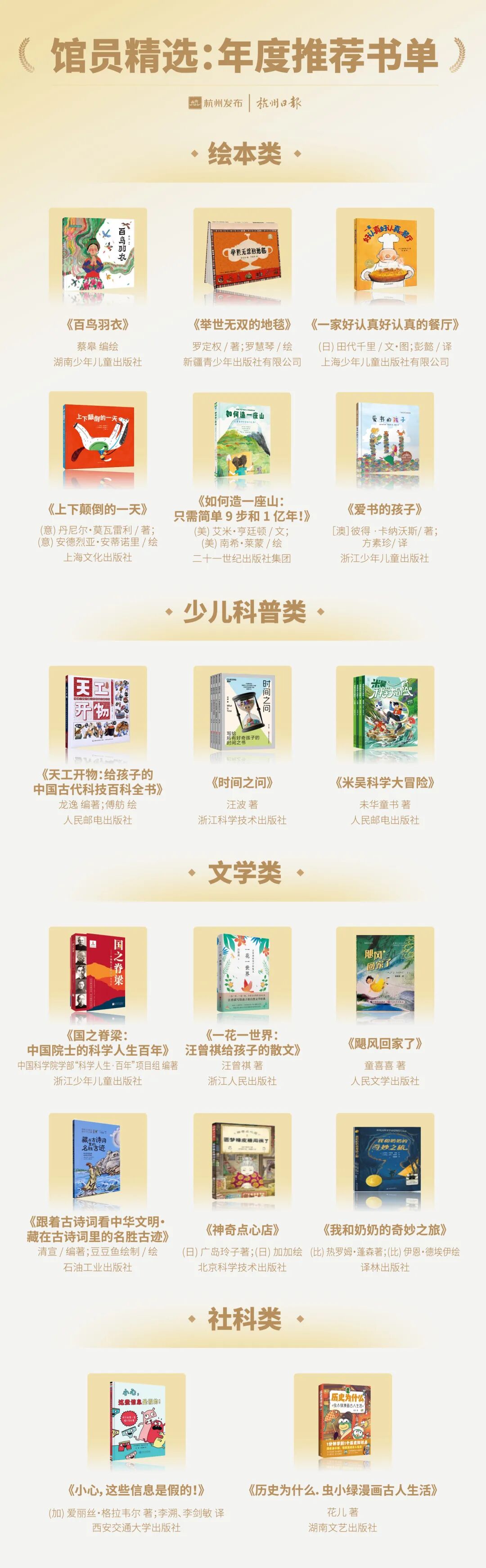 为了满足不同年龄段孩子的阅读口味,杭图少儿分馆馆员们精心挑选了这份书单,涵盖了绘本、科普、文学(中国/外国)及社科四大类,旨在全方位培养孩子的审美、科学思维与人文素养。