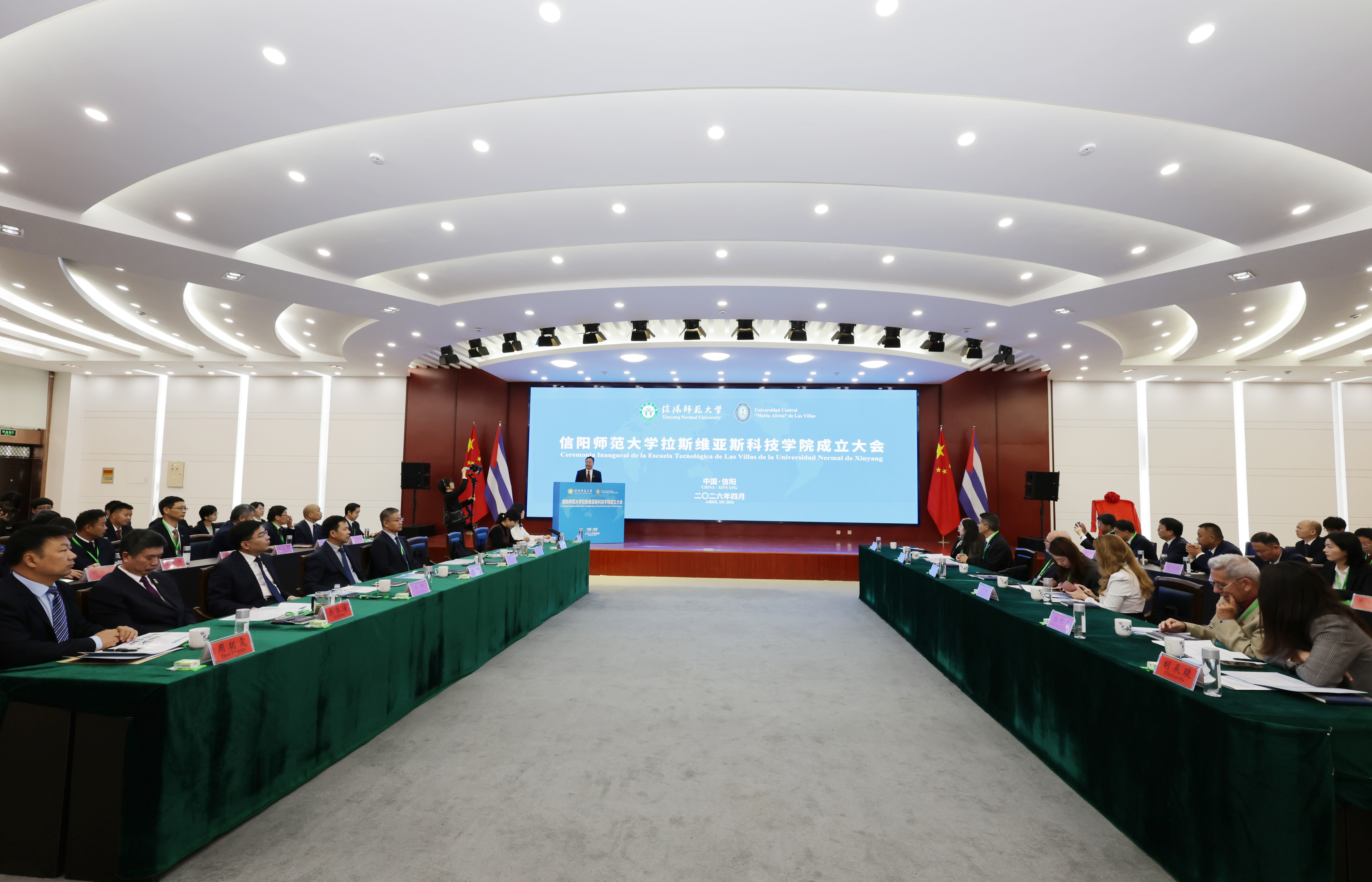 4 月 22 日,信阳师范大学拉斯维亚斯科技学院成立大会在艺术楼报告厅举行。古巴共和国驻中华人民共和国特命全权大使白诗德(Alberto Jesús Blanco Silva),古巴共和国驻中华人民共和国大使馆三等秘书艾琳(Aileen Díaz Bernal),古巴拉斯维亚斯中央大学校长路易斯・安东尼奥(Luis Antonio Barranco Olivera),古巴科学院院士、拉斯维亚斯中央大学教授代表拉米罗(Ramiro Alberto Pérez Vázquez),拉斯维亚斯中央大学国际处处长亚内利斯(Yanelys Delgado Triana);中共河南省委外事工作委员会办公室副主任李洪涛,河南省教育厅副厅长杨光,信阳市人民政府副市长袁钢等省、市相关部门领导;信阳师范大学党委书记王文鹏、校长余本海、副校长王娟,外事工作领导小组成员单位负责人、国际教育学院和相关合作学院负责人及师生代表出席大会。大会由王娟主持。