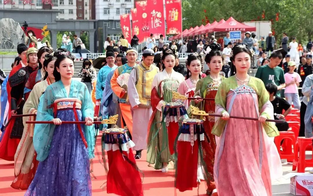 5月1日下午,汉唐宋明四朝婚礼秀华丽上演,锦衣华服、四朝同礼,集中展示不同朝代汉婚礼仪文化精粹。更有传统射礼演出、新人撒糖互动,还有机会获得献王小汉阙文创。