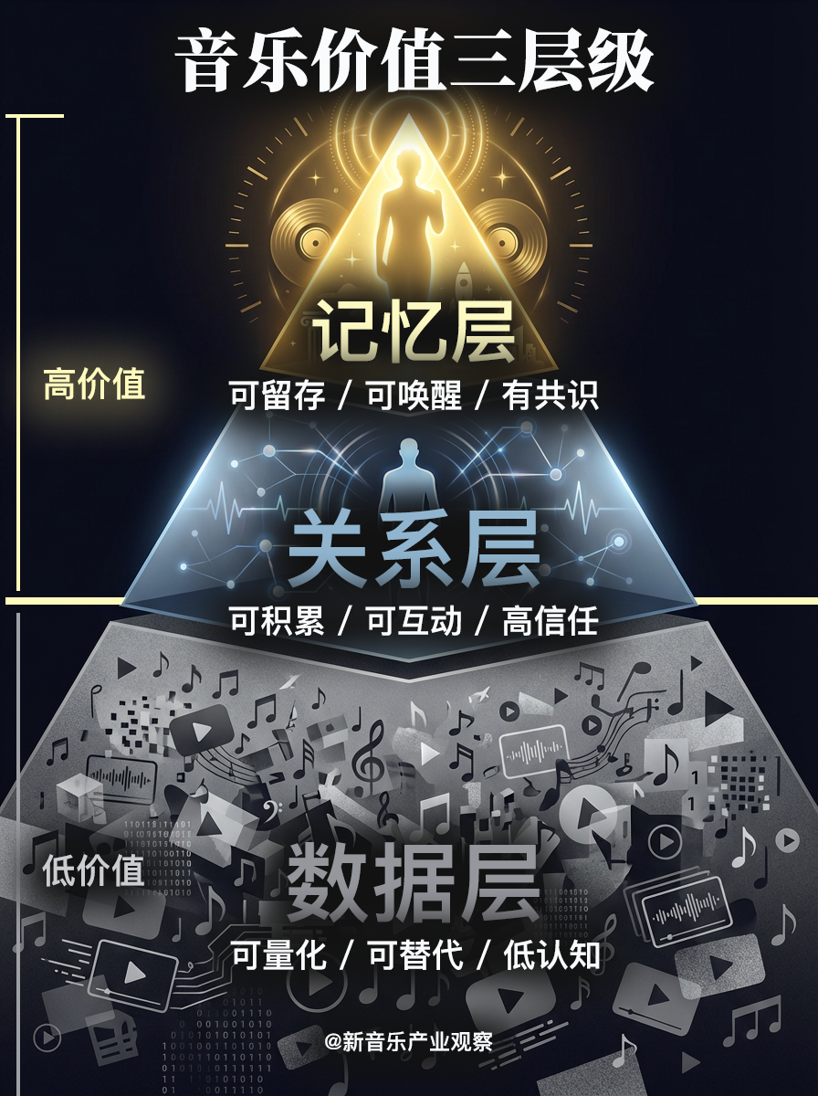记忆层则位于更高维度,在这一层中,艺人或音乐作品逐渐脱离具体传播场景,转化为集体记忆的一部分,可反复唤醒,在更长周期中获得稳定的行业地位。