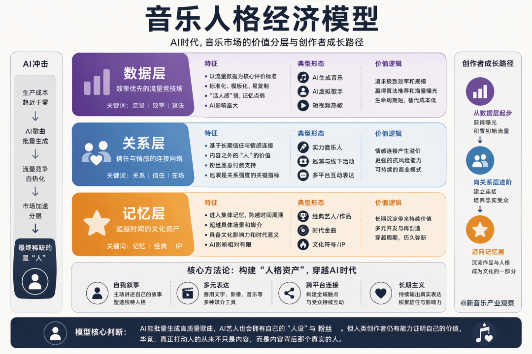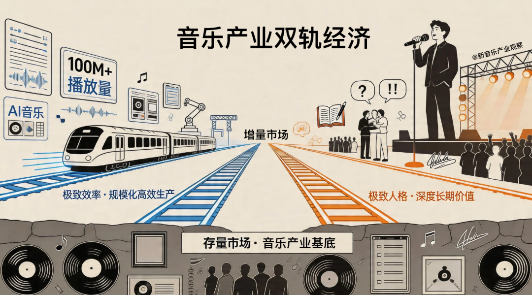 我们的判断是,在AI冲击之下,存量市场将进一步成为音乐市场的支柱,增量市场将双轨并行,一条轨道追求极致率,一条轨道则通向极致人格。