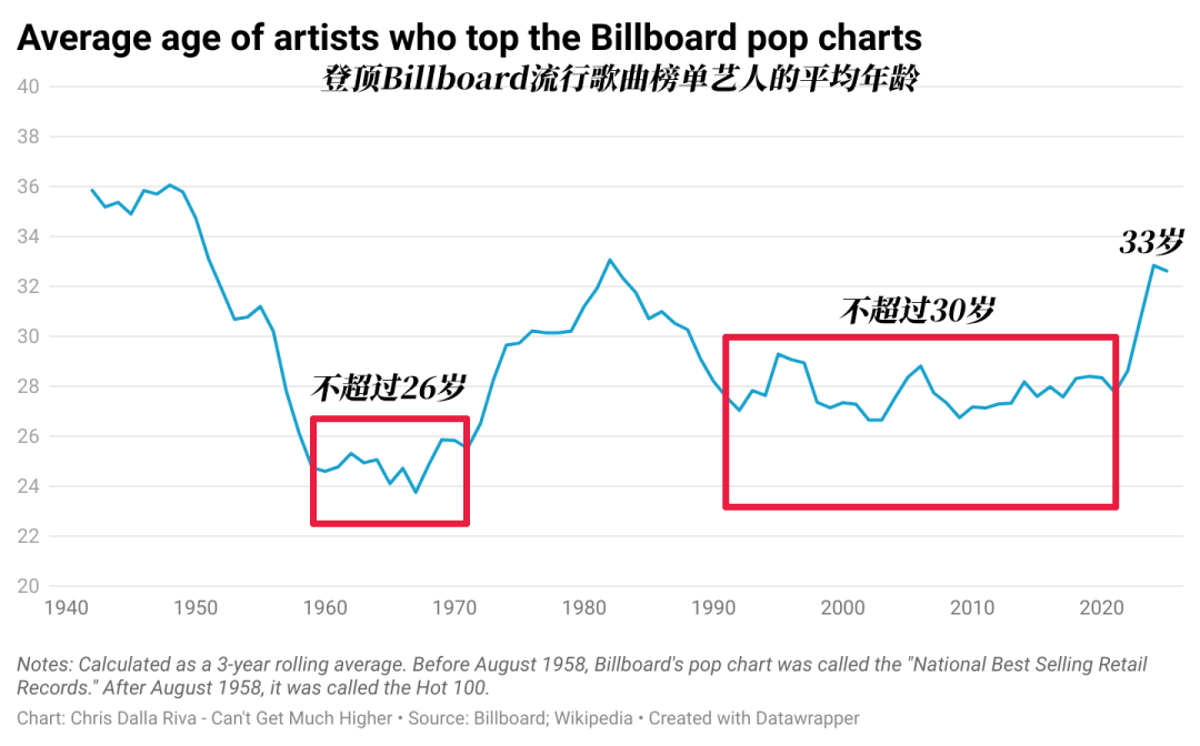 根据新音乐产业观察对国内几个主要音乐APP的热歌榜统计,上榜艺人的平均年龄约为34岁。巧合的是,2025年Spotify全球十大艺人平均年龄也约为34岁。另据数据分析师Chris Dalla Riva对Billboard上榜歌曲所做的统计,过去三年,Billboard Hot100上榜歌手的平均年龄为33岁。