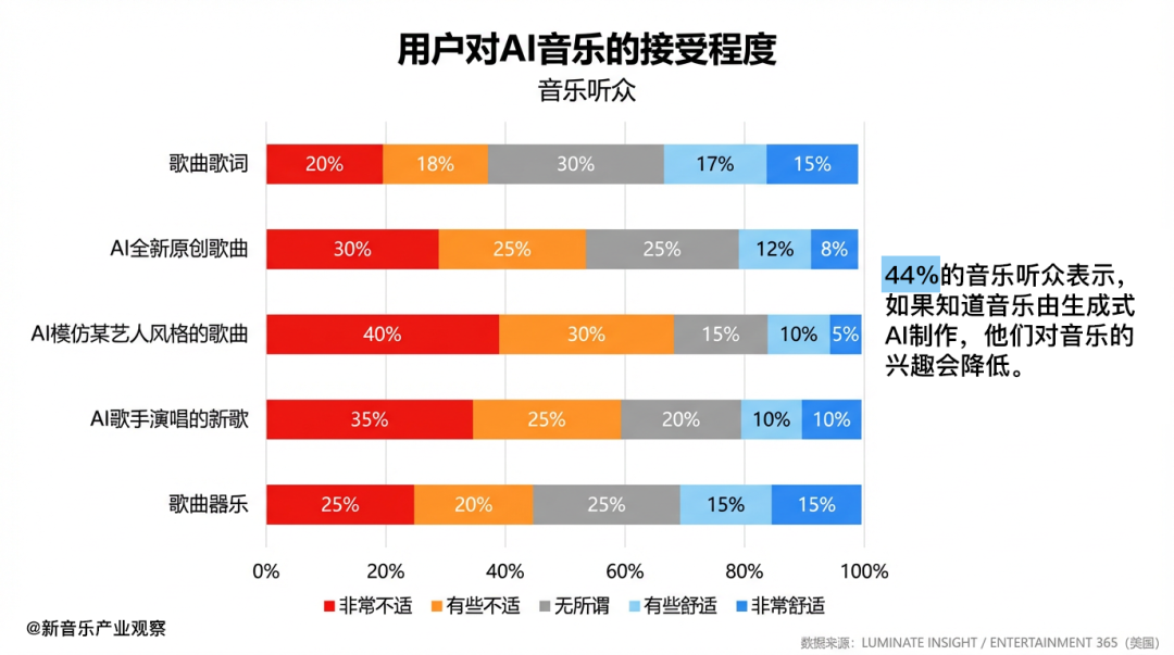 听众并不都反感AI音乐,Luminate发布的《2025音乐年报》显示,36%的千禧一代和37%的Z世代听众表示能够接受AI音乐。