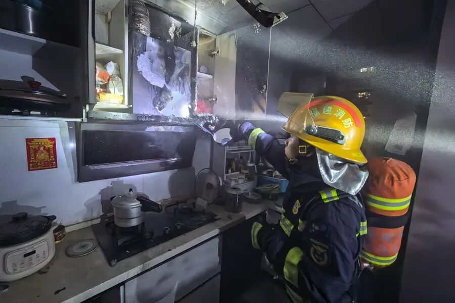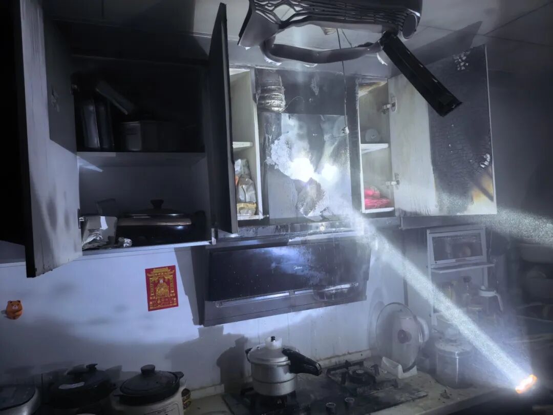 引燃了沾满油污的油烟机