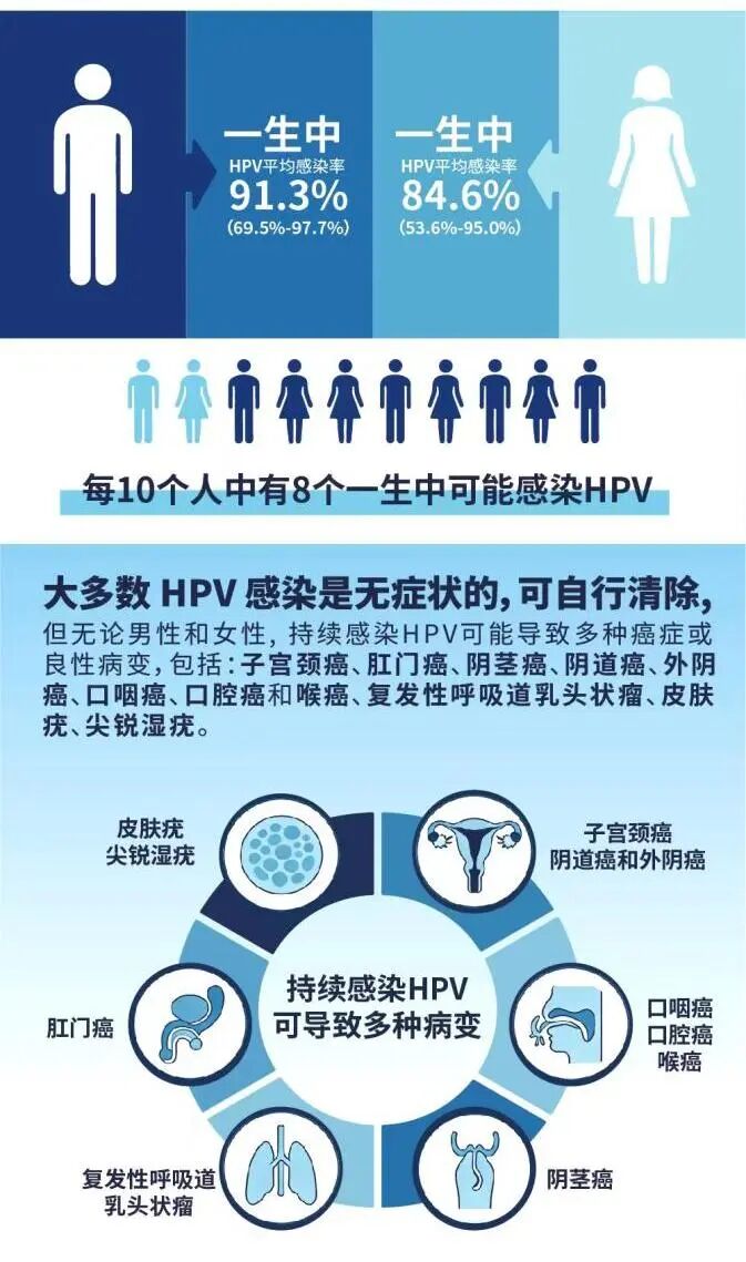 大多数 HPV 感染是无症状的,可自行清除【1】,但无论男性和女性, 持续感染HPV可能导致多种癌症或良性病变,包括:子宫颈癌、肛门癌、阴茎癌、阴道癌、外阴癌、口咽癌、口腔癌和喉癌、复发性呼吸道乳头状瘤、皮肤疣、尖锐湿疣【1】。