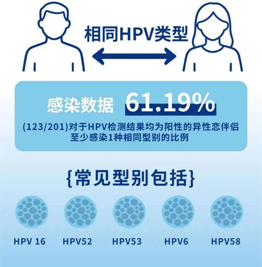伴侣间感染的HPV型别存在一致性:一项温州市异性伴侣的HPV流行病学研究显示【5,c】,对于HPV检测结果均为阳性的异性恋伴侣,至少感染1种相同型别的比例为61.19% (123/201) ,其中最常见的型别包括HPV 16、52、53、6以及58 型。