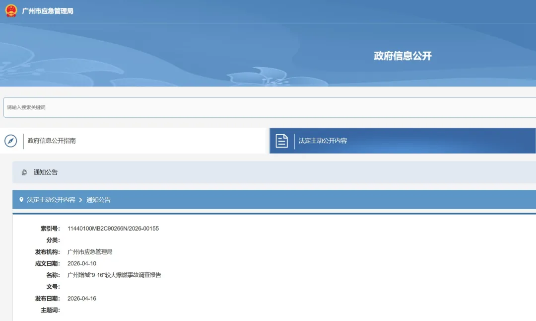 近日,广州市应急管理局公布了《广州增城“9·16”较大爆燃事故调查报告》。