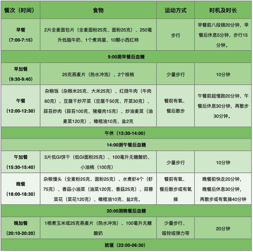 一日生活作息+食谱+运动计划表(不注射胰岛素)