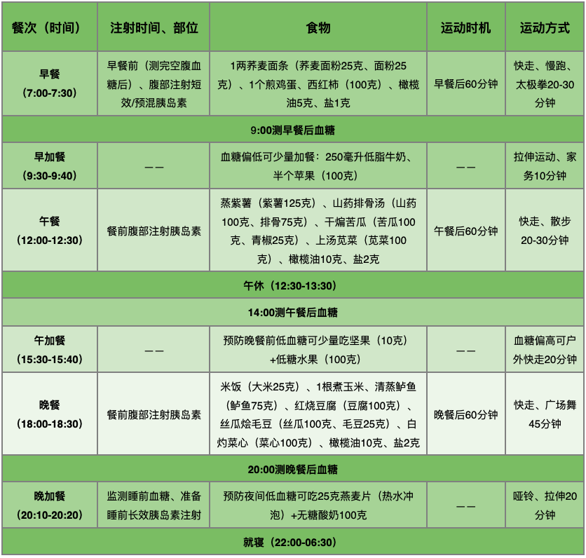 一日生活作息+食谱+运动计划表(注射胰岛素)