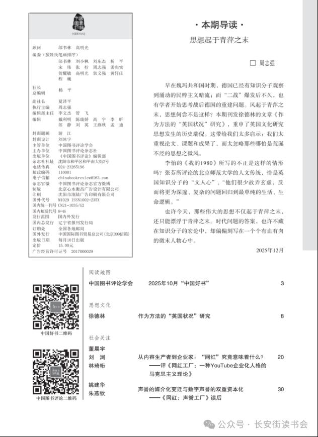 徐德林在《中国图书评论》2025年第12期撰文《作为方法的“英国状况”研究》指出,在英国文学、文化和思想史上,作为一个概念的“英国状况”(condition of England/condition-of-England),意指19世纪30年代末40年代初,工业革命的完成促成了英国从农业文明到工业文明的转型,但工业化带来的财富与英国大众尤其是英国工人阶级的贫困形成了巨大反差,即英国工人阶级非但没有因为工业革命的完成获得幸福或更高品质的生活,反而因为经济危机频发,长期生活在贫困、饥寒和疾病之中。这样的一种“英国状况”让无数英国文人陷入了“现代性焦虑”之中,开启了对何为进步、何为幸福、何为美好的生活等问题的思考,于是便有了他们以消除“英国状况”为旨归的文化和社会批评,以“文化”为匙的“美好社会”建构。19世纪英国文人托马斯·卡莱尔的“英国状况”研究的开创之功并不仅仅在于他揭示了英国人的工具理性崇拜,更重要的是他阐释了社会转型时期文人的社会担当。这对当下中国的文人而言,毋庸置疑具有极其重要的方法论意义。