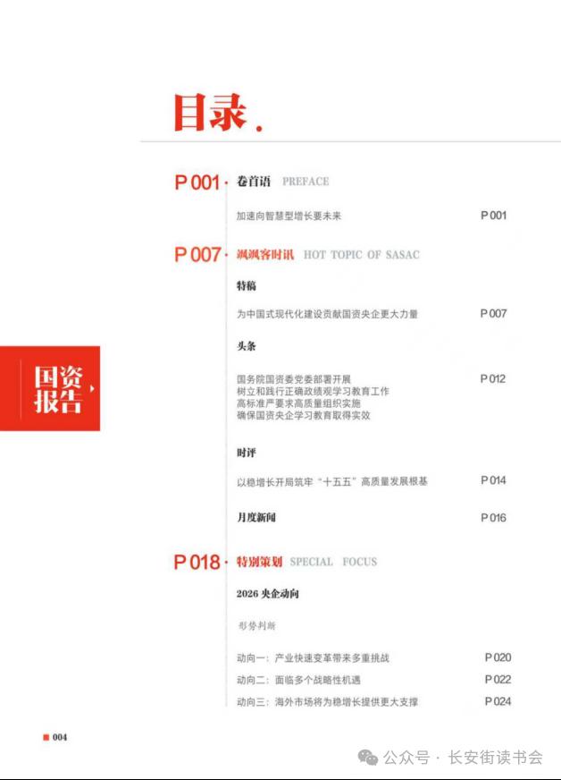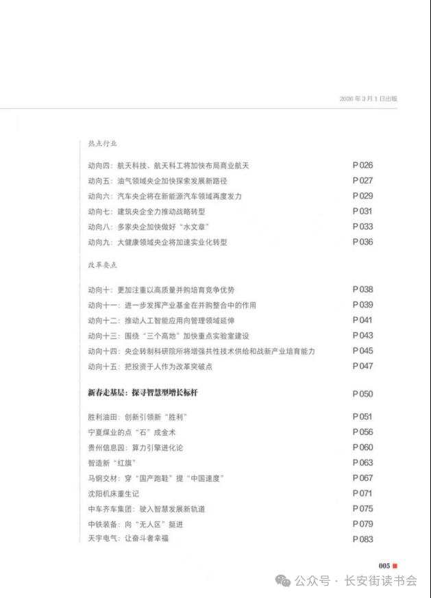 刘青山、原诗萌、粟灵在《国资报告》2026年第3期撰文《2026央企动向》指出,2026年是“十五五”规划的开局之年,在当前复杂严峻的经济形势之下,综合剖析动向,对于央企更好开展工作,对于其产业链上下游企业更好加强合作尤为重要。大多数央企判断,当前的经济环境和产业快速变革给企业带来了多重挑战,同时也存在着战略性机遇。这些对趋势的判断,是宏观经济走势的重要信号,反过来也会对宏观经济发展起到重大影响。面对“十五五”开局之年的新形势新挑战,央企研判宏观形势和产业变革,分析自身短板和优势,捕捉战略机遇,提出了一系列创新务实的举措,展现了其地位作用和使命担当,也为中国经济的发展注入了信心和动能。