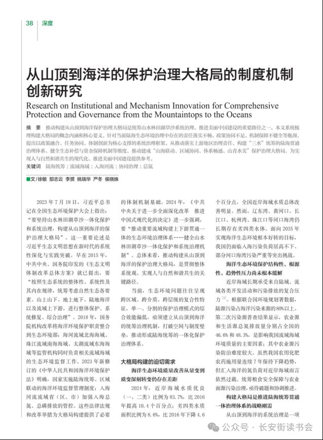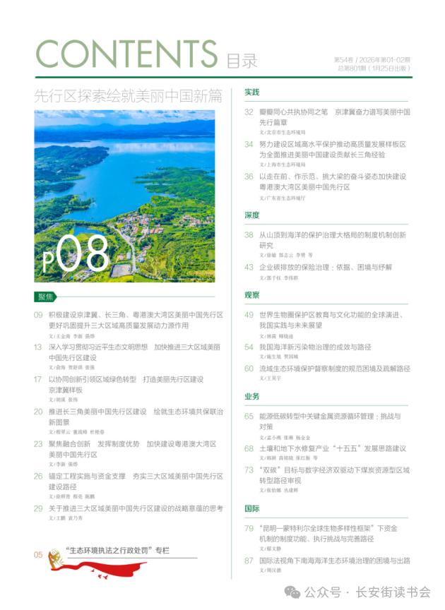 徐敏、郜志云、李赟、严冬、姚瑞华、侯晓姝在《环境保护》2026年第1-2期撰文《从山顶到海洋的保护治理大格局的制度机制创新研究》指出,构建陆海贯通保护治理大格局是推进美丽中国建设的重要路径之一。当前,我国海洋生态环境质量改善仍面临结构性、根源性、趋势性压力,陆海生态环境管理体系有待深度融合,入海河流上游地区治理责任不明确,政策“组合拳”合力尚未形成,跨区域跨部门协调联动机制不健全。这些瓶颈制约着陆海统筹一体治理体系的建设进程。研究提出,构建大格局需以政策融合、任务协同、体制创新为核心支撑,遵循总体思路、基本原则、总体目标和实施路径的系统框架。重点任务包括:强化陆源污染源头管控,明确并压实上游地区责任;推进陆海有效贯通,实施以“水资源—水生态—水经济”三水统筹为核心的系统性治理;依托国家既有战略与协作框架,创新陆海统筹机制;在典型流域—河口海湾开展试点示范,总结经验做法和治理模式。文章强调,通过推动建成“山海联动、区域协同、体系畅通、山青水美”的保护治理大格局,为实现人与自然和谐共生的现代化、推进美丽中国建设提供坚实支撑。