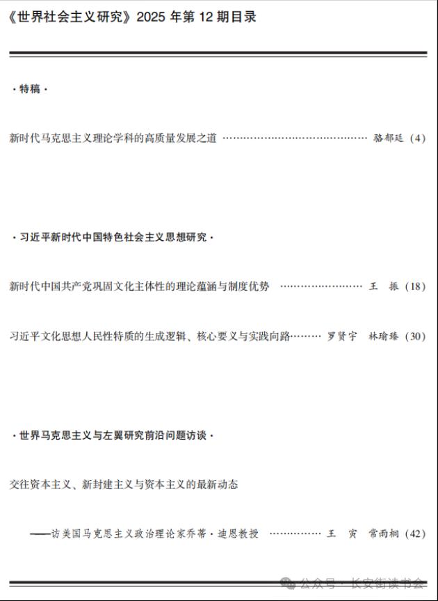 骆郁廷在《世界社会主义研究》2025年第12期撰文《新时代马克思主义理论学科的高质量发展之道》指出,高质量发展是新时代马克思主义理论学科的生命线,是马克思主义理论学科应对时代挑战、夯实自身根基、发挥引领作用的核心支撑,是马克思主义理论学科始终保持生命力、时代感和引领性的必然要求和根本路径。新时代马克思主义理论学科要实现高质量发展,必须坚持规范化建设,严格按照国务院学位委员会马克思主义理论学科评议组制定的标准和规范来进行建设;坚持整体化发展,协同推进横向整体化、纵向整体化与整体层次化;坚持创新性探索,增强原始性创新的突破力、集成性创新的整合力、转化性创新的融合力、阐释性创新的穿透力与教学性创新的传播力;坚持自主性建构,构建马克思主义理论学科的自主知识体系。这种自主知识体系是马克思主义理论学科自主性的集中体现——它以马克思主义为根本指导,以中国实践为理论源泉,以中华优秀传统文化为深厚根基,以时代问题为构建导向,既具备解释中国的理论能力,又拥有引领未来的思想伟力。它的形成,彰显了马克思主义理论学科的主体性与原创性,是马克思主义理论学科高质量发展的根本标志与不竭动力。