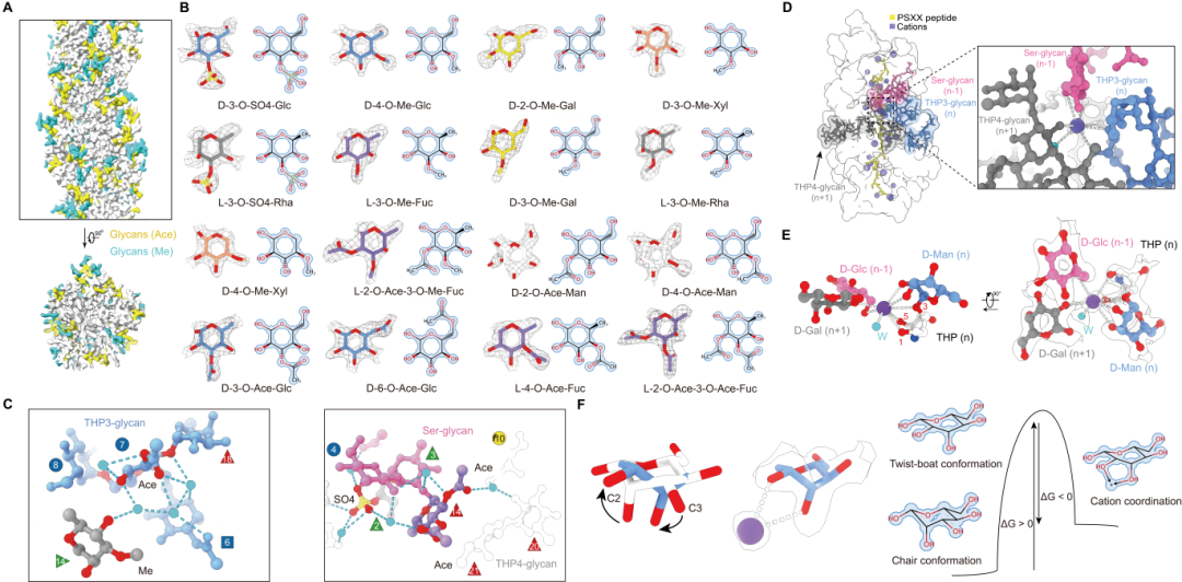 在 O-糖质结构方面,研究团队进一步解析了基于 PSXX 四肽重复形成的高级糖质纤维。结构显示,3,4,5-三羟基脯氨酸(THP)和丝氨酸位点被致密糖基化,形成规则排列的表面“糖刺”样突起,并共同构建出稳定的糖质纤维骨架。研究首次在该体系中鉴定出罕见的 THP 修饰,并精确揭示了由八种单糖及多种共价修饰共同构成的复杂 O-糖质折叠形式。更为重要的是,高分辨率密度图还揭示出广泛存在的有序水分子网络和多价阳离子配位中心。这些此前难以被直接观测的结构因素,通过氢键网络和配位作用显著增强了糖质之间的相互作用。其中,金属阳离子可介导跨越重复单元的八配位网络,增强糖质螺旋核心的机械刚性,并伴随特征性的甘露糖“扭船式”构象翻转,以实现局部能量补偿,为理解复杂糖质装配体稳定性的物理化学基础提供了直接实验依据。