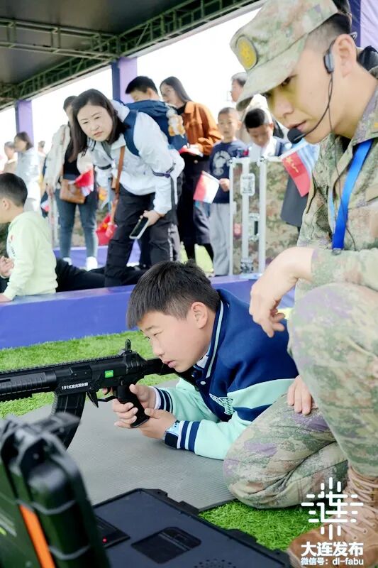 在参观人群中,一支由六七名身着迷彩服的孩童组成的队伍格外引人注目。他们来自旅顺当地一所驻军幼儿园,此次在老师与家长的带领下,共有二十余名师生前来参观,王雪与她的两个孩子是这支队伍中的成员。王雪: