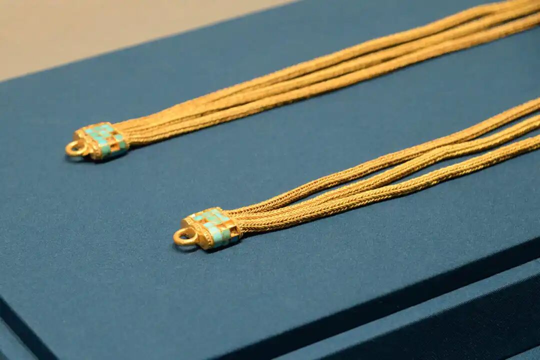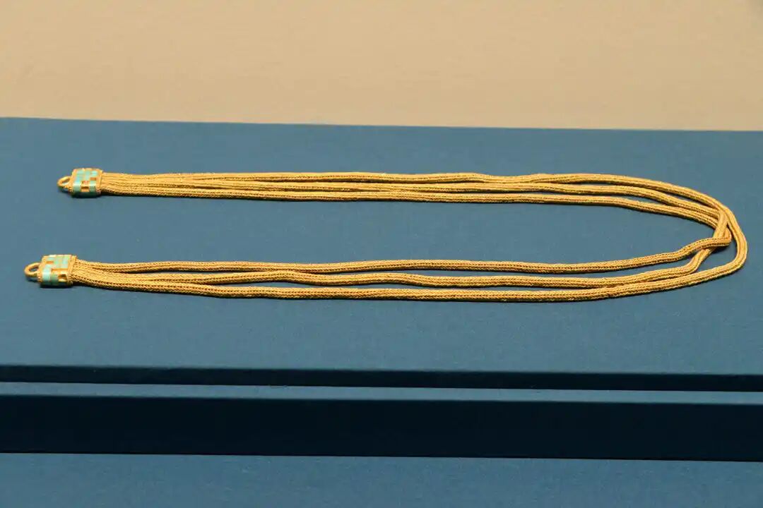 魏晋南北朝时期,吐谷(yù)浑立国青海,雄踞西北。这条镶绿松石金链发现于都兰2018血渭一号墓,这是一座唐代早期的吐谷浑王室墓。