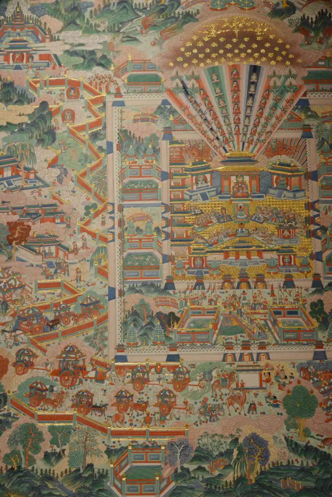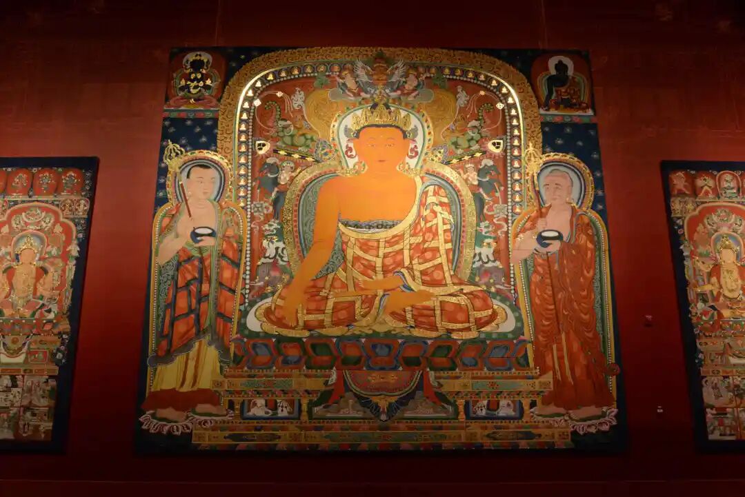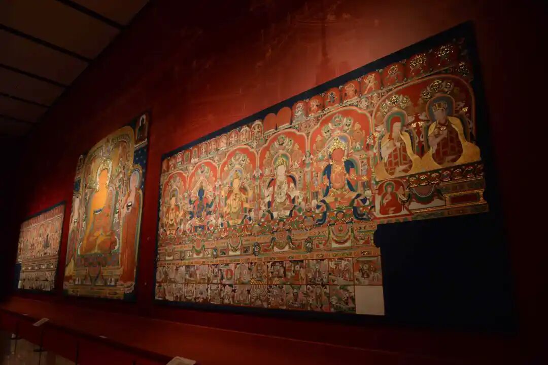 殿堂壁画构图严谨、设色厚重,以矿物重彩、沥粉贴金昭示皇家气象,技法承袭中原工笔精髓,又结合了藏传佛教造像风格。