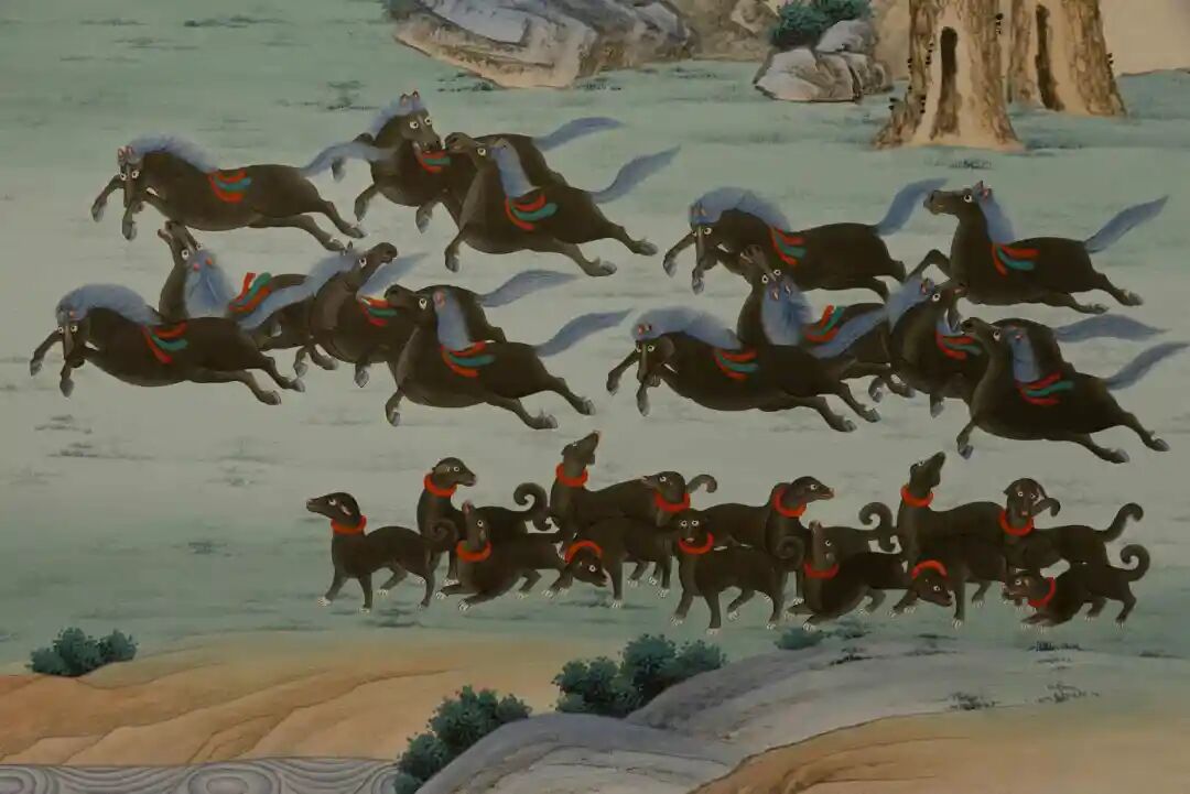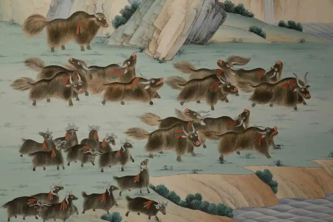 行走的牦牛、撒欢的马和下方站立的羊、狗,形成巧妙的动静关系。