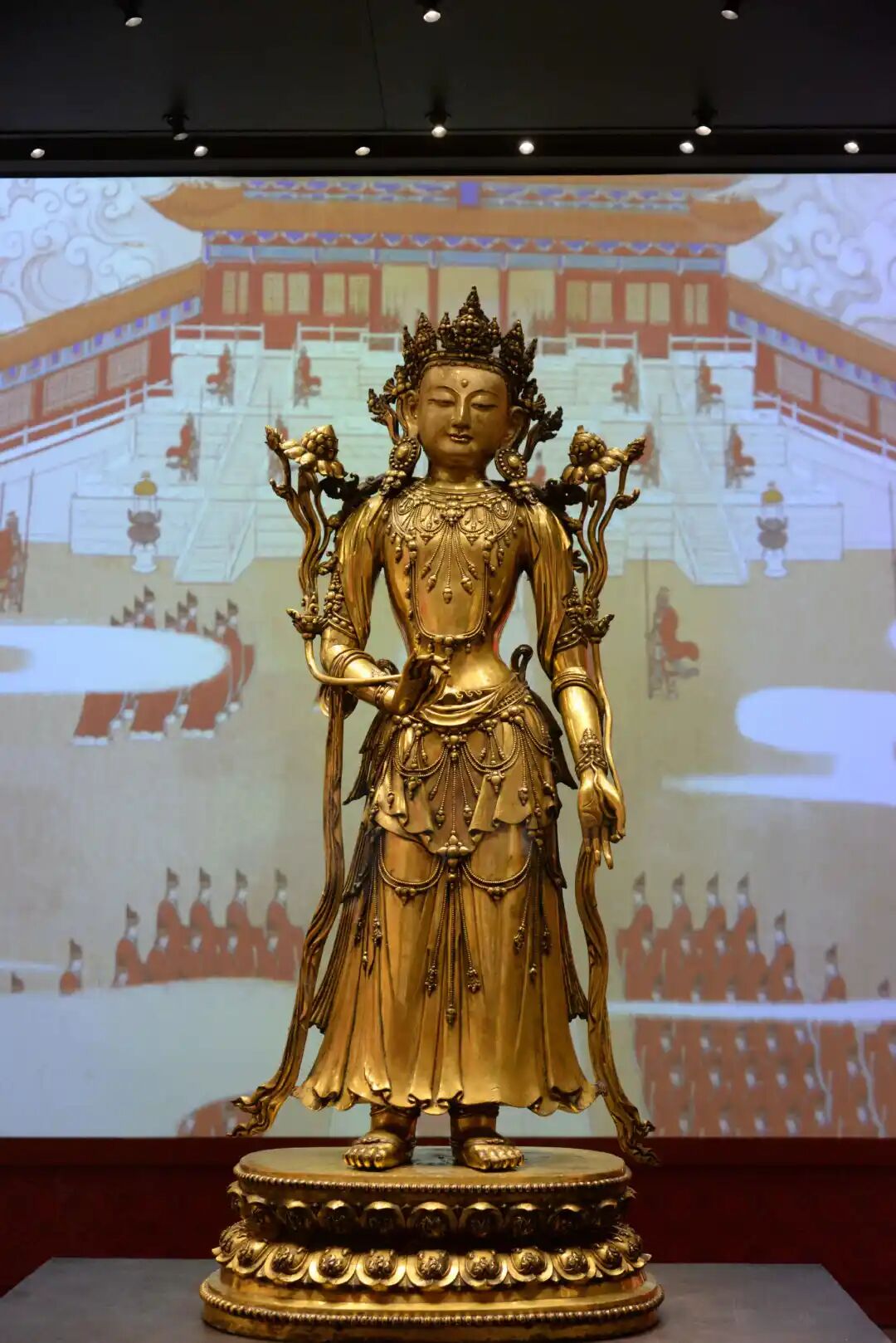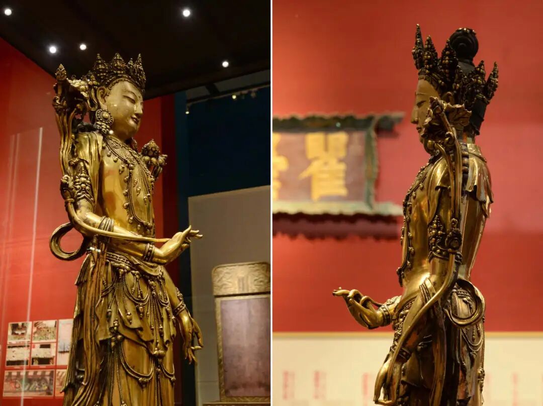 展览上最令人惊喜的文物,莫过于这尊高达146.5厘米的观音菩萨造像,它是我国目前发现的体积最大的永乐金铜造像。